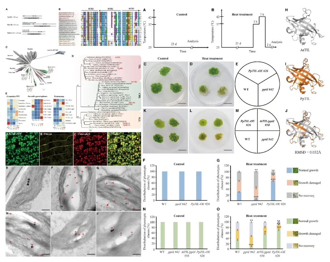 研究结果表明,PpTIL与有花植物拟南芥AtTIL的氨基酸序列和蛋白三级结构高度保守。PpTIL基因的表达受高温、低温、盐胁迫、干旱和脱落酸显著诱导,其功能缺失突变体对热胁迫高度敏感,活性氧积累显著增加;而基因过量表达则提升植株的热胁迫耐受性,拟南芥AtTIL基因能回补PpTIL基因缺失突变体的热胁迫敏感表型,表明TIL基因在陆生植物非生物胁迫响应中的功能保守性。与有花植物TIL仅定位于质膜不同,PpTIL在叶绿体和质膜均有定位,且参与调控小立碗藓的多个关键发育过程。在原丝体发育阶段,PpTIL通过参与生长素的生物合成与转运,影响绿丝体向轴丝体的转变。在植株形态建成中,PpTIL参与调控苔藓从二维到三维的生长转变,基因缺失突变体更早形成茎叶体,而过表达植物的茎叶体发育则显著延迟,且成熟后基因缺失和过表达株系的茎叶体数量均显著增加但体积变小,与三维生长标记基因PpSCR1、PpCLV1a/b、PpCLE3等的表达变化高度相关。此外,PpTIL还调控发育相关转录因子的活性,影响植物原生质体的再生与分化过程。