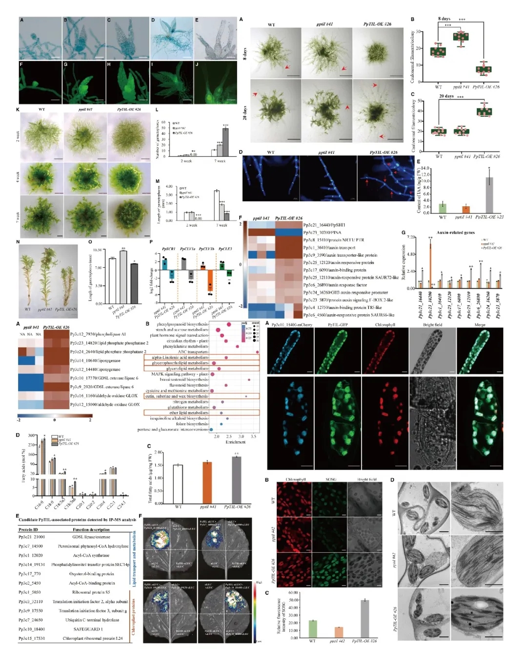 图2 PpTIL参与调控二维生长向三维生长转变、茎叶体发育、脂质代谢和1O?胁迫