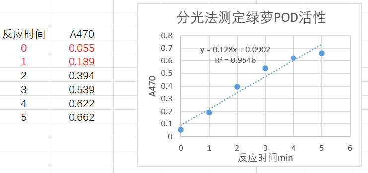 取0.5 克绿萝叶片,加入5 ml提取液冰浴匀浆,制成10%匀浆液,12000 rpm 4℃离心10 min,取上清置于冰上;BCA蛋白定量试剂盒(货号:RTP7102)测定蛋白浓度为2 mg/ml;按照测定步骤操作,使用1 ml石英比色皿(光径1 cm),设定分光光度计检测波长470 nm,间隔1 min记录数据,采集5次;时间对吸光值做线性回归曲线,0-1 min线性较好,1 min内△A=0.189-0. 055=0.126。酶活定义:每毫克蛋白(mg prot)每分钟在1000 μl反应体系中使 470 nm 处吸光值增加0.001为一个酶活力单位 U。