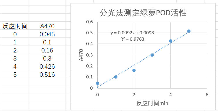 绿萝POD活性测定-按样本蛋白浓度计算:取0.5 克绿萝叶片,加入5 ml提取液冰浴匀浆,制成10%匀浆液,12000 rpm 4℃离心10 min,取上清置于冰上,BCA蛋白定量试剂盒(货号:RTP7102)测定蛋白浓度为2 mg/ml(Cpr=2);按照测定步骤操作,取50 μl样本(V样=0.05)测定,设定酶标仪检测波长470 nm,间隔1 min采集数据,采集5次;时间对吸光值做线性回归曲线,1-6 min(T=5)线性较好,5 min内△A=0.459-0.067=0.392。计算公式: POD(U/mg prot)=0.392/(0.05×2)×1/5×1=0.784 U/mg prot。