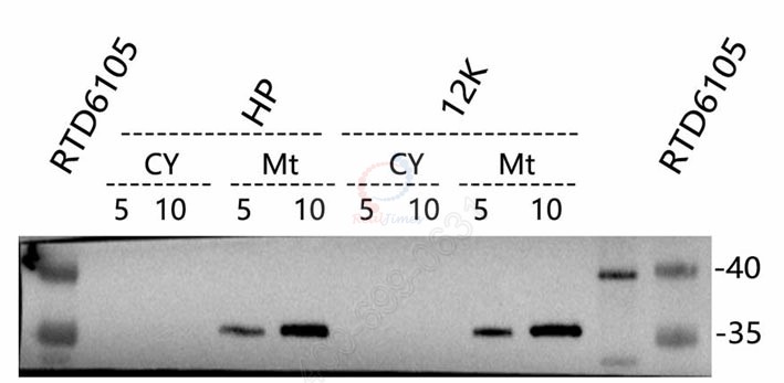 样品:小鼠肾脏组织用不同方法动物线粒体提取试剂盒提取,HP表示用密度梯度分离提取, 12K表示12000 g离心力收集线粒体沉淀; CY为提取上清-胞浆蛋白;Mt为提取线粒体蛋白;用1×Laemmli