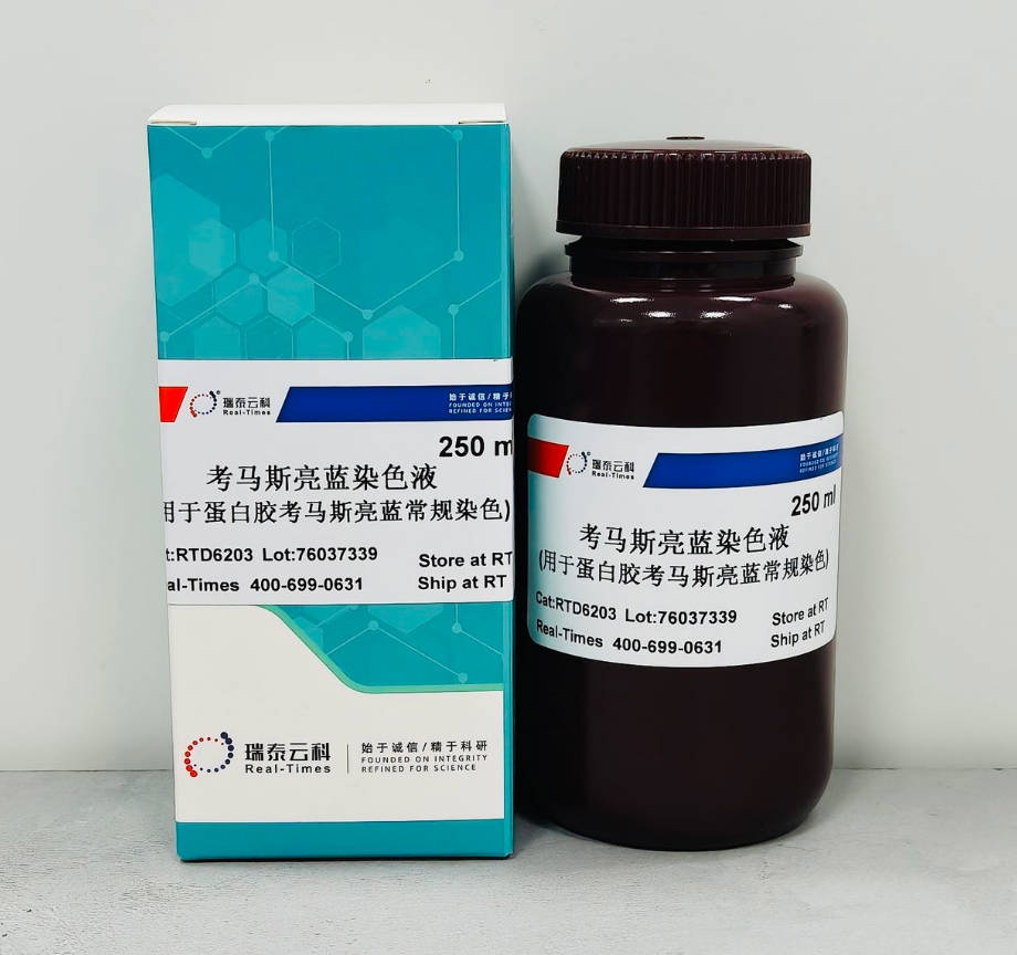 考马斯亮蓝染色液(Commassie Blue Staining Solution)是以考马斯亮蓝G-250为主要成分,采用新配方配置而成。可用于SDS-PAGE或非变性PAGE胶(native