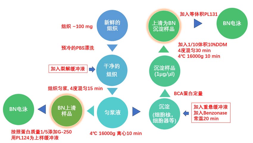 该产品含有BN电泳样品制备及电泳上样所需的试剂,可以在约90分钟内完成动物组织样品中胞浆蛋白和膜蛋白的提取。提取原理:动物组织在裂解缓冲液中匀浆处理得到细胞悬液,离心分离得到上清和沉淀;上清为胞浆蛋白,沉淀为细胞核,线粒体,内质网,未裂解的细胞碎片等;随后用温和去垢剂增溶沉淀,离心后提取增溶后的蛋白(主要包含质膜蛋白,细胞器膜蛋白,核膜蛋白);提取的蛋白适用于蛋白多聚体分析,酶活测定以及WB检测等。